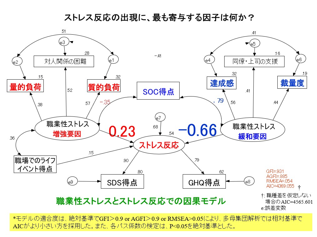 中央の「ストレス反応」に対して、色々な矢印が入っていますが、これは、ストレス反応に対して、どの程度影響しているのかを数字で表しています。